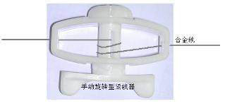 直接把合金線穿過緊線器中間的孔(如下圖),主要的作用是把合金線拉直,以免合金線太松影響總體美觀,另外太松容易造成倆根線搭在一起照成短路(一旦短路就會進行報警,屬於誤報。電子圍欄的原理是不會産生誤報的)