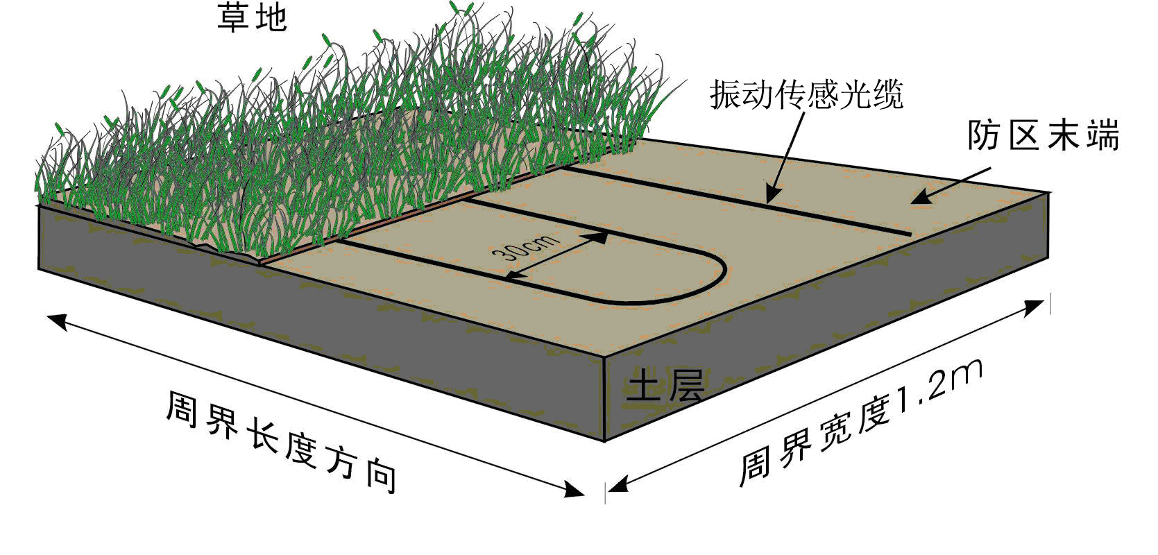 在沙土地下埋設振動傳感光纜時,也採用平行鋪設多道振動傳感光纜的鋪設方式,但由於沙土比較松軟,當入侵者進入該區域時,透過沙土層對振動傳感光纜施加壓力,振動傳感光纜可探測到微小的擠壓變形並産生信号,所以在沙土地埋設振動傳感光纜時,應減少平行振動傳感光纜的間距,而且埋設不可過深。通常採用的間隔爲20--25cm,埋設深度爲5--10cm,如圖。在進行施工時,首先在需要鋪設光纜的區域挖出一道寬1.2m,深10cm的凹槽,在凹槽的底部平鋪一層厚度爲3cm的粗沙,再将振動傳感光纜平行鋪設於粗沙表面,每隔50cm用鋼絲線卡子固定。光纜鋪設完成後,在其上面覆蓋一層厚度爲5cm的粗沙,最後在其表面均勻地覆蓋一層1--2cm的地表介質(細沙或松散幹燥的泥土)。